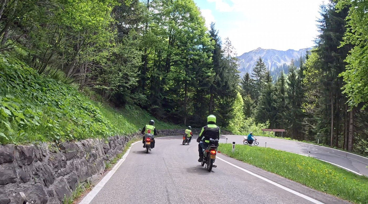 “We”, zijn Fré op zijn GTS50, Stefan op de K80, Wim op de K80, Wybe op een Honda SS50 en ik op mijn blauwe GTS50. De motoren stonden op de aanhanger en na een voorspoedige dagreis kwamen we bij Büchboden aan in het hart van het natuurpark Grote Walsertal.